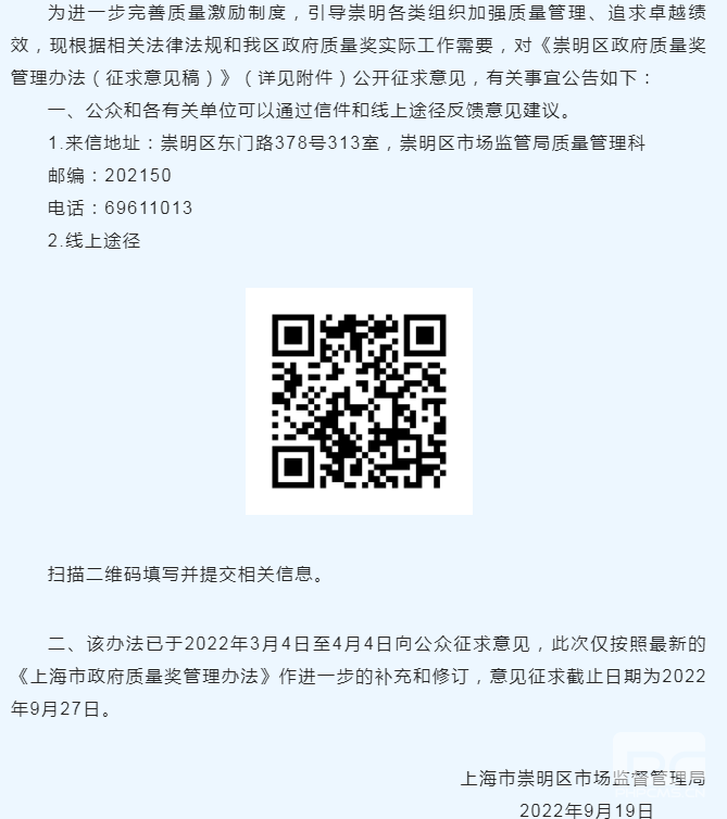 申報(bào)崇明區(qū)政府質(zhì)量獎(jiǎng)的組織應(yīng)在組織內(nèi)部進(jìn)行公示,公示時(shí)間不少于5個(gè)工作日。